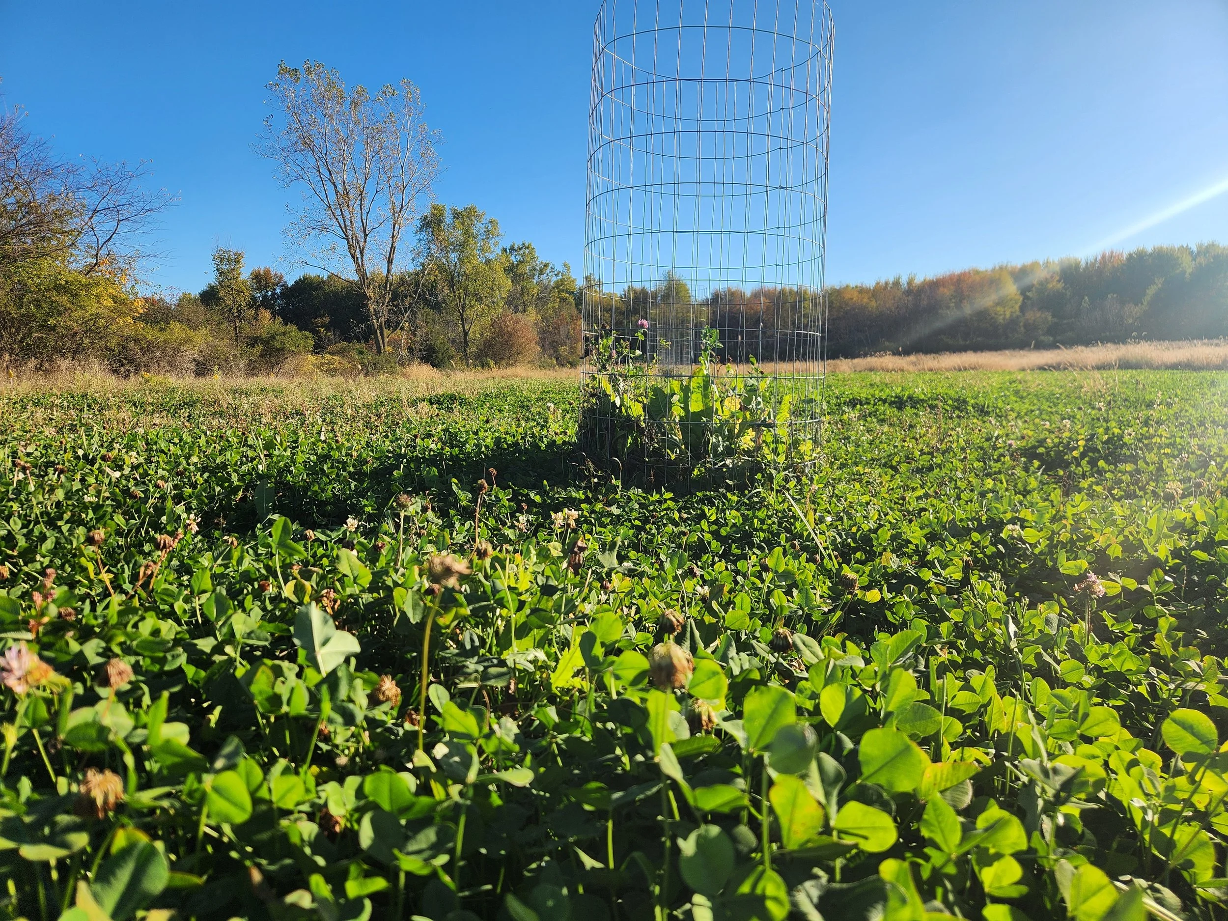A blend of clover; all raw seed (no seed coating) and no annuals. In this trial, it produced the least tonnage of the group and the deer are not hitting it very hard. It was slow to get out of the ground and has been the weediest of the observation plots.